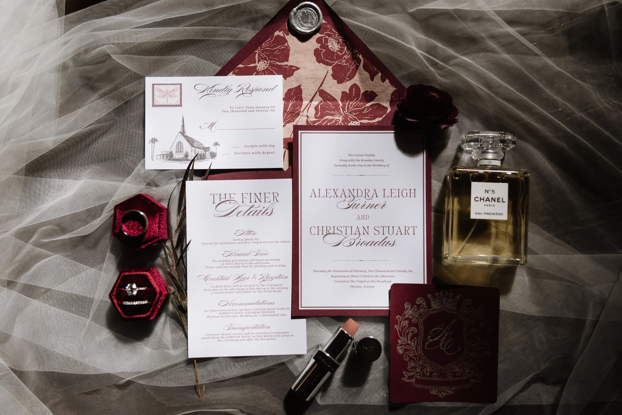 invitation suites (2), wax seals, customized satin drink tower ribbons